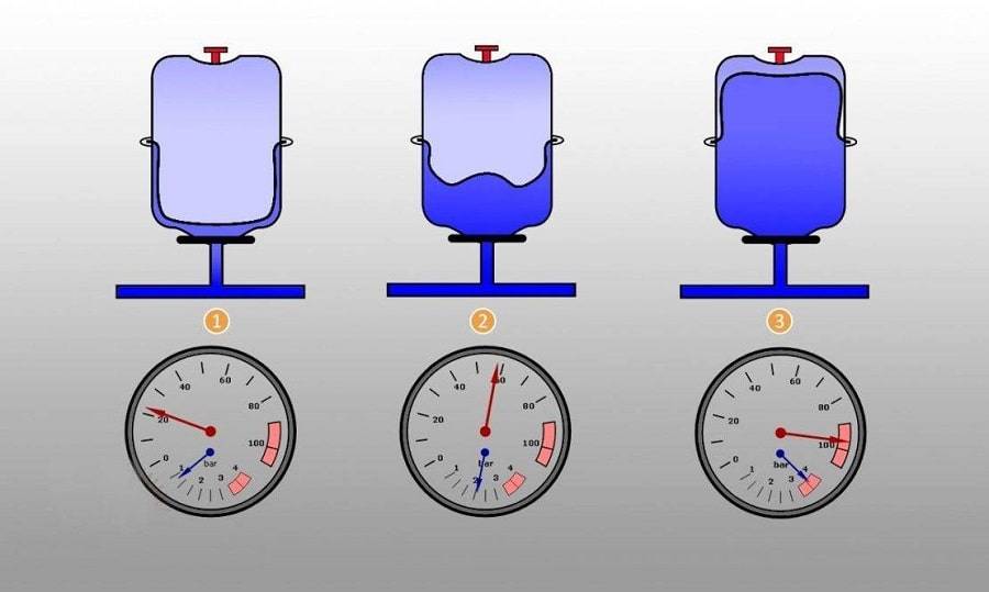 В свою очередь, эффективность расширительного мембранного бака зависит от нескольких параметров: начального и максимального давления в системе, первоначального воздушного давления камеры.