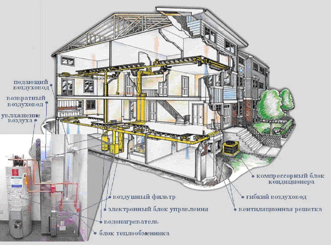 Полноценная воздушная отопительная система. Ее основным преимуществом считается возможность комбинирования с такими системами, как вентиляция и кондиционирование. Грамотно собранное воздушное отопление может поддерживать оптимальную температуру в комнатах, невзирая на жару и мороз за окном – кроме того, она отлично справляется с задачами очистки загрязненного разными запахами воздуха. Самое интересное во всем этом то, что энергопотребление такого чуда техники в разы меньше, чем если бы человек устанавливал отдельно отопление, кондиционер и вентиляцию в доме.