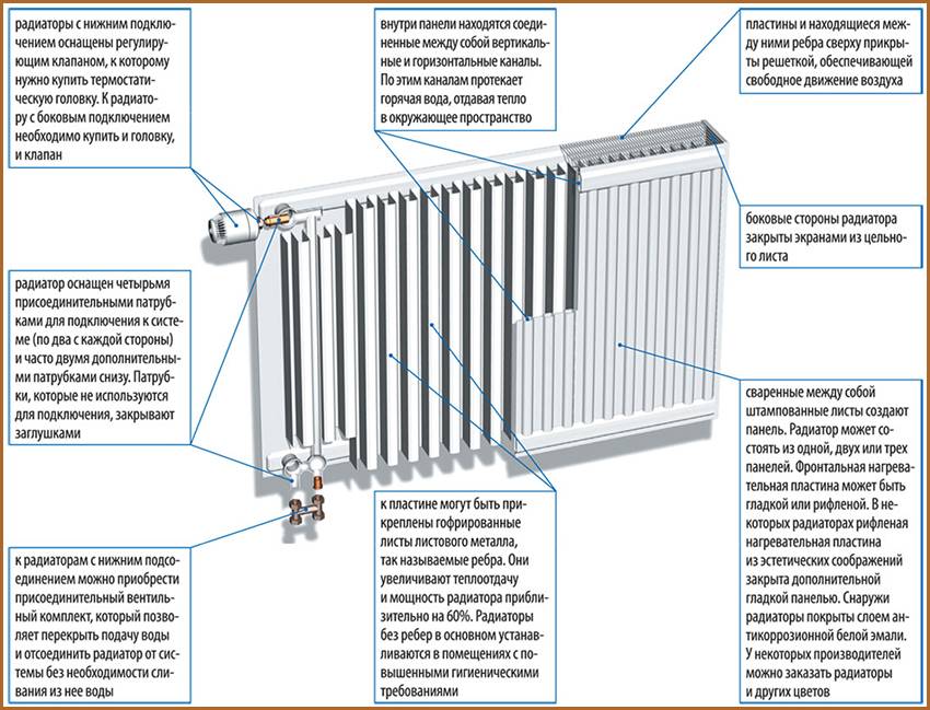 Панельные формируются из двух стальных листов, соединенных герметичным прочным сварочным швом. Между ними циркулирует теплоноситель. Бывают одно-, двух- или трех-панельными. С конвектором или без него. По способу подключения к системе отопления делятся на радиаторы с нижним и боковым (правым или левым) подключением. Некоторые имеют два типа подключения одновременно.