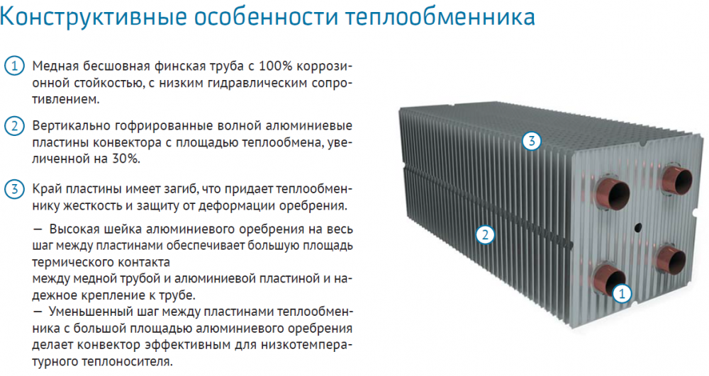 - долговечность и устойчивость к коррозии медно-алюминиевого теплообменника специальной конструкции;