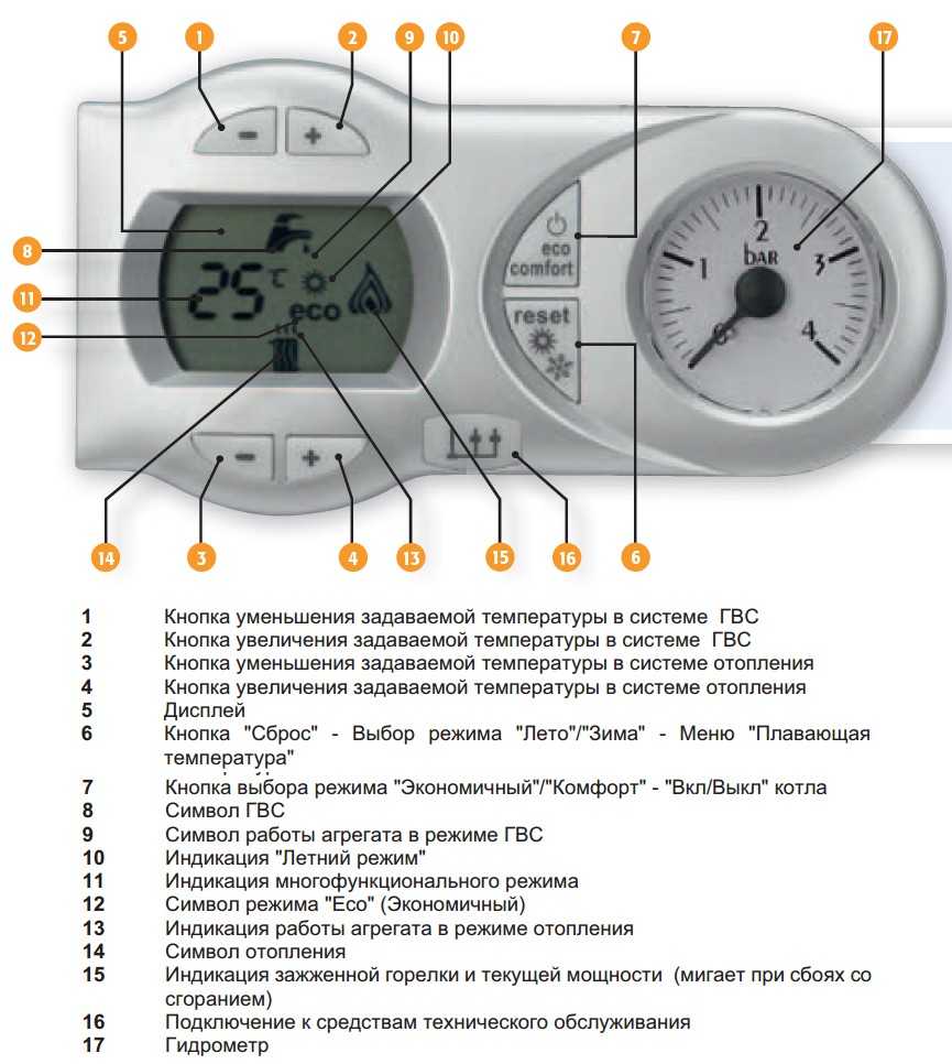 Панель управления и индикации котлов Diva (нажмите чтобы увеличить)