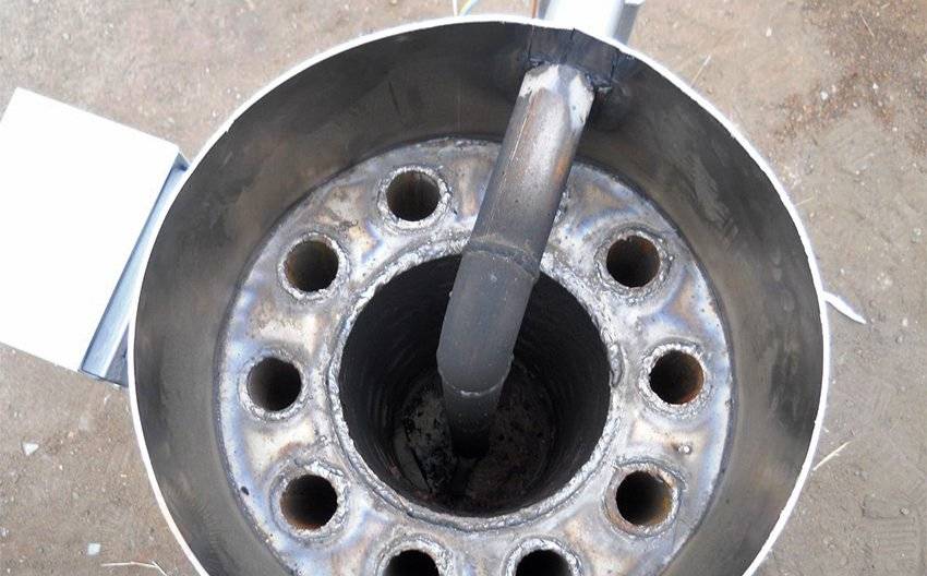 - Конструкция сваривается. Необходимо просверлить воздушное отверстие вверху топливной камеры. Труба перфорируется. На этом работы завершены.