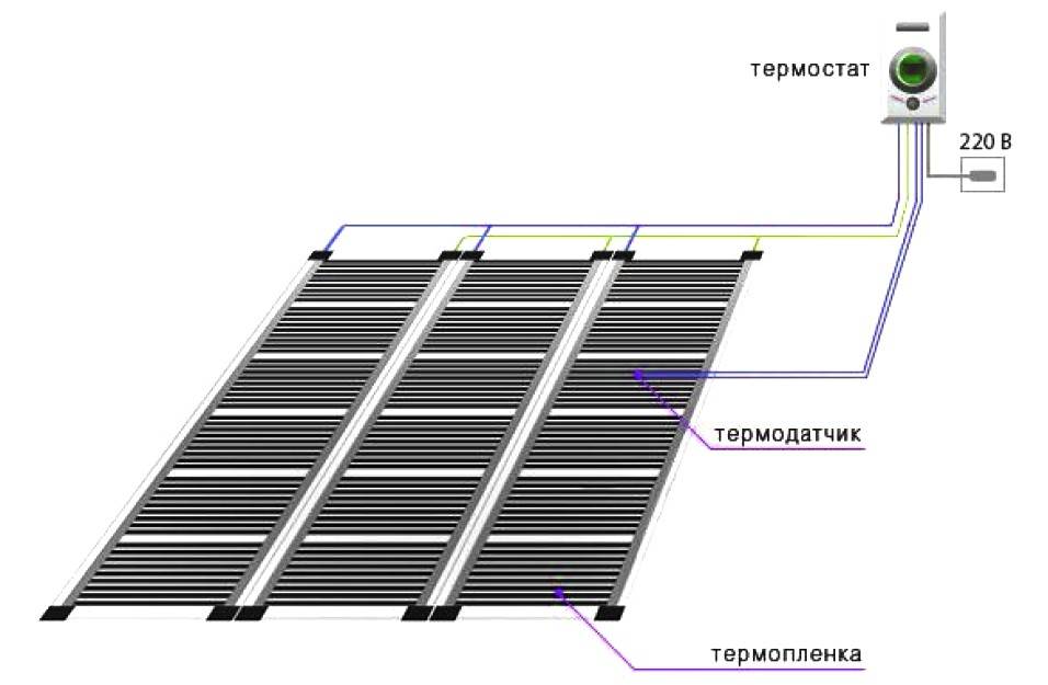 Подключите провода к терморегулятору согласно инструкции изготовителя. Если система будет иметь мощность более 2 кВт необходимо подключить терморегулятор через автомат. Тестирование производится при заданной температуре 30 градусов. Необходимо проверить нагрев всех участков плёнки, отсутствие искрения и нагревания мест соединения.