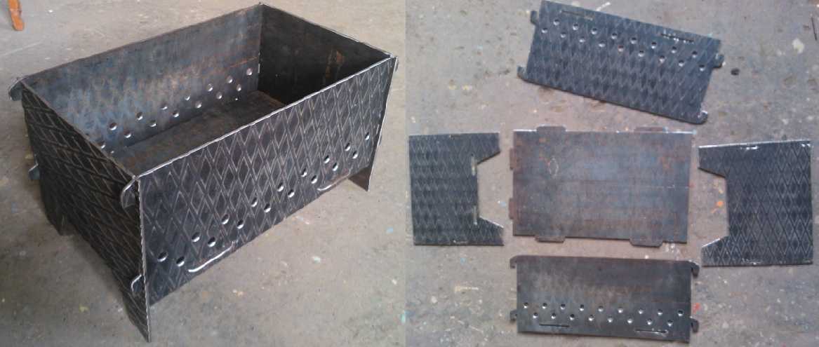 Развести огонь для жарки шашлыка на природе зачастую проблематично. Кирпичи под деревьями не растут, а приносить с собой неподъемный сварной мангал тяжело. Поэтому смекалистые рукодельники придумали чертежи на облегченный сборно-разборный мангал.