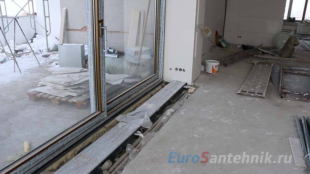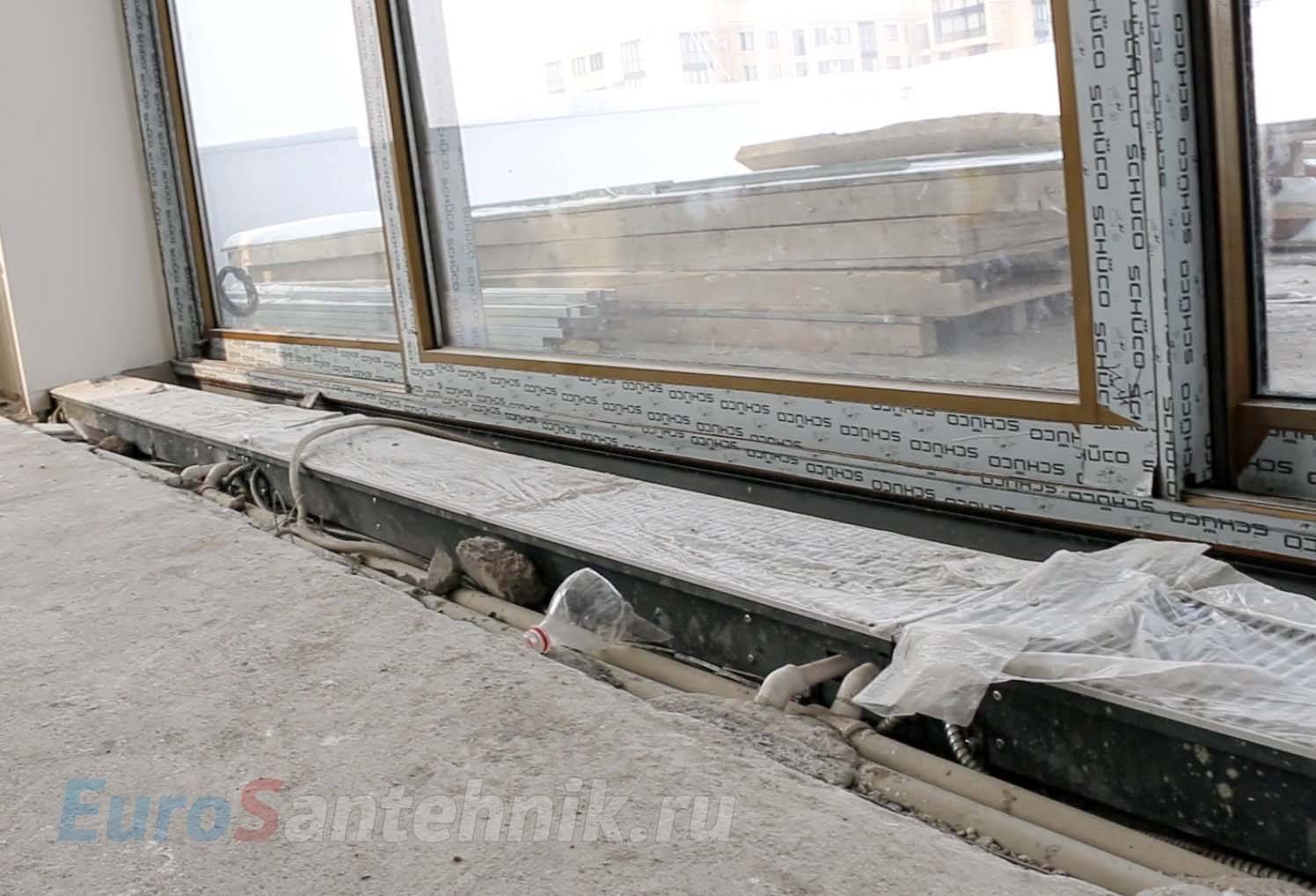Итак, соединения должны находиться в коробке конвектора. Давайте рассмотрим все нюансы на примере монтажа внутрипольные конвекторов водяного отопления для витража с большой алюминиевой дверью. Лучше всего, когда конвектор ставится в створ ниши. Окно имеет створ, и в идеале необходимо установить конвектор внутрь этого створа. Хитрость заключается в том, чтобы оконные занавески не заслоняли собой оборудование