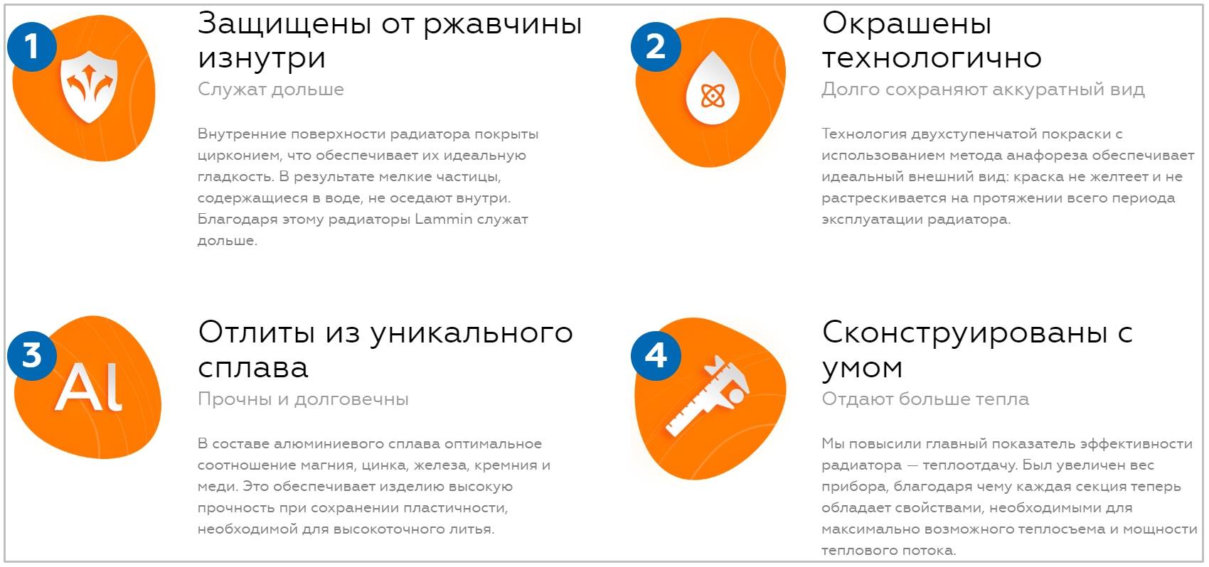 Обеспечена коррозийная стойкость и надежность радиатора во время работы. Внутренний каркас покрыт запатентованным стальным сплавом, применяется аэрокосмическая техника сварки Tech 3. Внешняя поверхность корпуса тоже идет из качественного сплава — EN — AB 46100. Система литья автоматизирована, что позволяет добиться высокой точности. Вертикальный пролив увеличен, одна секция обогревает до 1,85 м2. Тесты проводились в лаборатории, на практике. Для установки 10 и менее секций нужно 3 кронштейна, после 10 — 4 штуки (по 2 сверху и снизу).