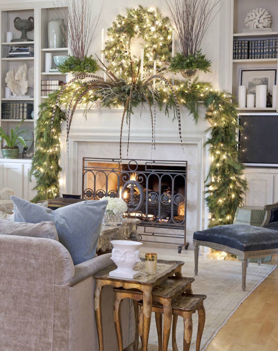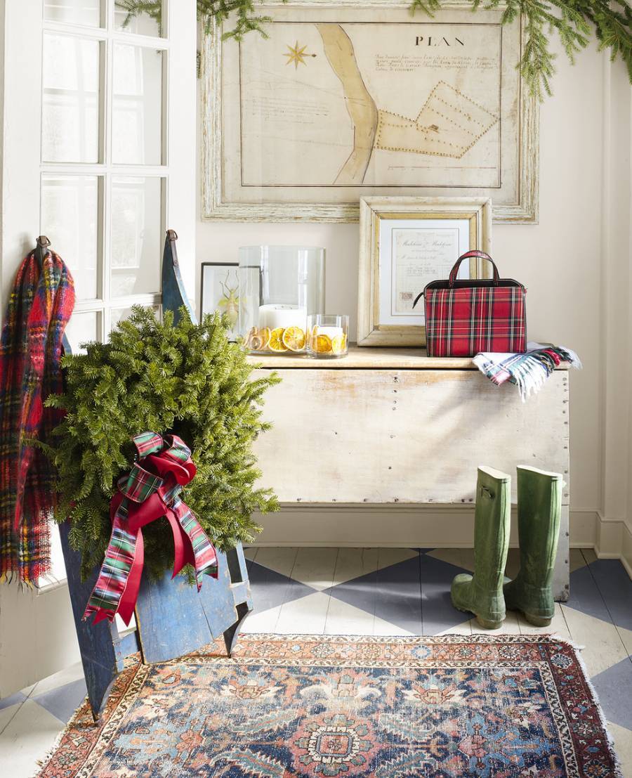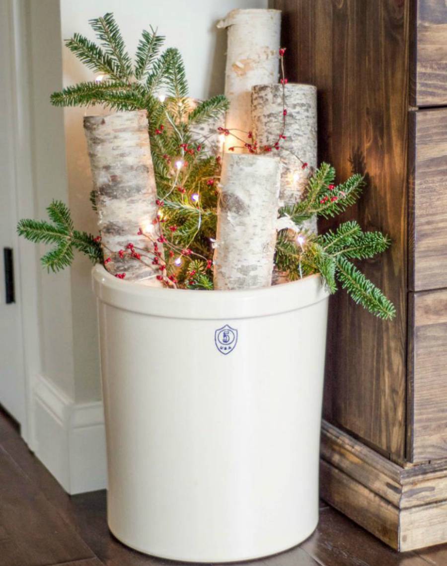 Верните огни гирлянд. Но не на елку, а хотя бы так — создав в прихожей вот такую композицию из березовых поленьев, веток рябины с красными ягодами и, конечно же, с огнями. Согласитесь, насколько теплее будет заходить в дом, когда с порога видишь такое чудо.