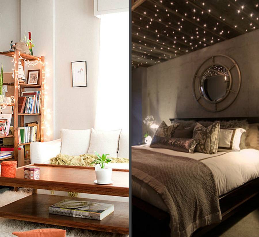 Мерцающие новогодние гирлянды можно использовать как дополнительное освещение, украсив ими полку в гостиной. Или, прикрепив на потолок спальни, задействовать их как ночник. Под таким «звездным небом» можно спать хоть зимой, хоть летом — оно успокаивает и умиротворяет…