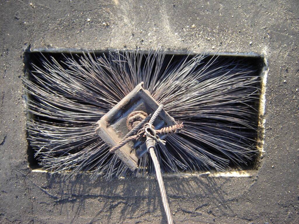 Очищение сверху возможно только до первого изгиба трубы. Дальше чистку печки с помощью груза можно выполнить, если разобрать дымоход. Не разбирая трубы, очищают ее только со стороны помещения специальными приспособлениями. Для удобства работу выполняют через ревизионные люки. Для работы используют жесткую щетку на гибком тросе. Инструмент запускают в ревизионный люк или прямо в топку и постепенно продвигают вверх, прочищая один участок за другим. Всю собранную во время чистки сажу выбрасывают.
