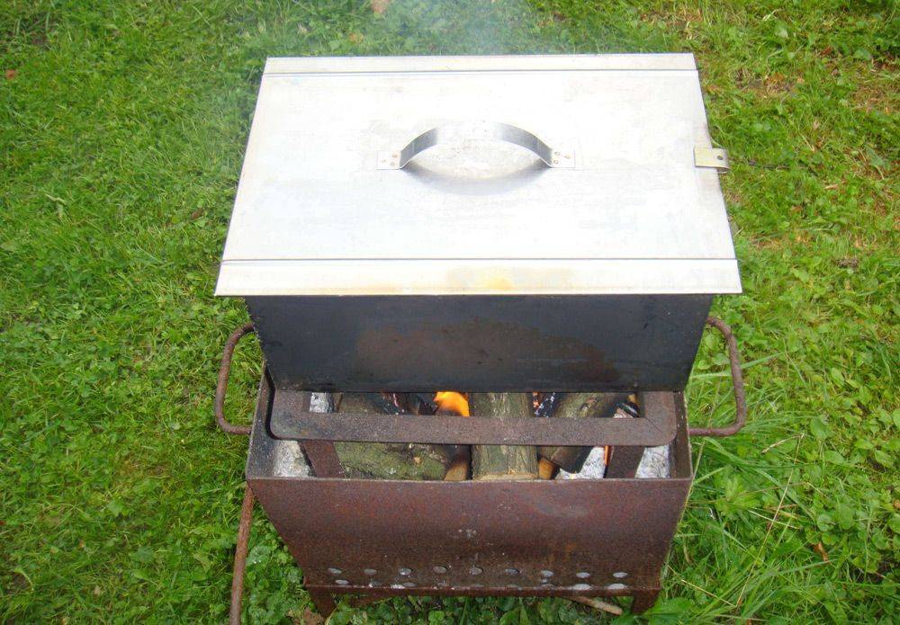 Нередко к боковым частям привариваются ручки, что значительно расширяет географию ее применения: кроме квартиры, ее можно легко перевезти летом на дачу или взять с собой на рыбалку. Источником тепла для разогрева щепы может быть как газовая или электроплита, так и разожженный на природе небольшой костер.