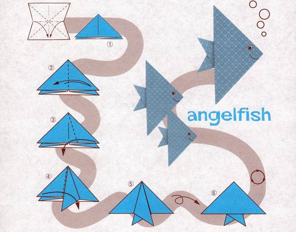 Умение складывать из салфеток поделки пригодится и для детского праздника. Как пример, создадим украшение из бумажной салфетки на стол в виде симпатичной рыбки. Для этого сгибаем салфетку по диагонали.Затем отгибаем верхний угол на себя. Обе части опускаются вниз так, чтобы концы поделки выходили за его пределы. Опять загибаем углы в центр изделия. Кладем на тарелку и намечаем глазик с помощью бусинки. Данная схема украшения стола салфетками в виде рыбки предоставлена на фото ниже.