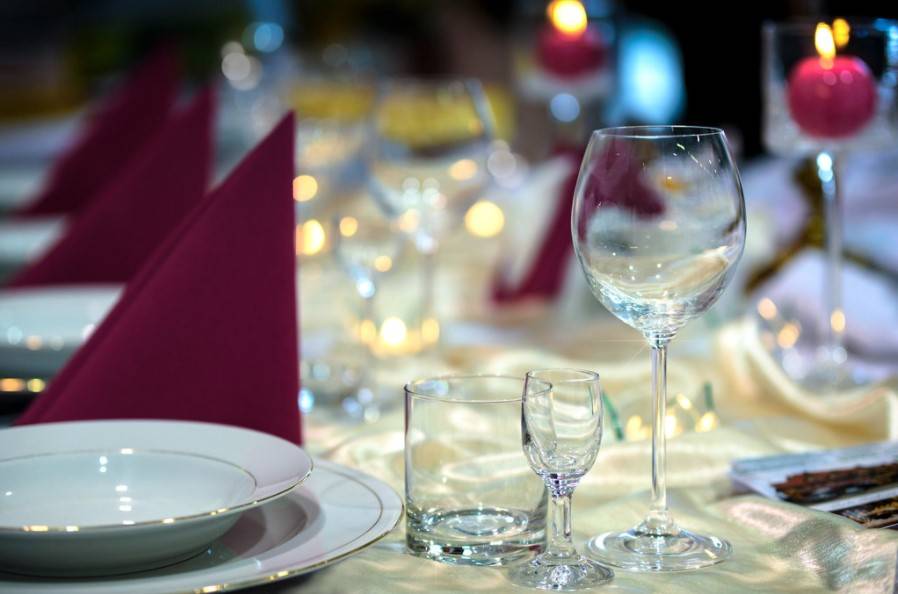 Подчеркнуть важность мероприятия помогут красиво оформленные салфетки у тарелки. Они могут располагаться в бокале, на блюде
