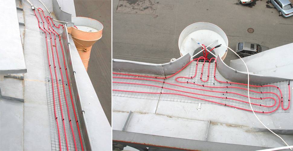 Чтобы избежать образования наледи на крыше, для стока воды в канализацию освобождают путь. Для этой цели создана система обогрева плоской кровли, которая применяется и на крутых скатах. Если выполнять подогрев крыши, этого окажется мало. Вода будет в течение дня стекать в желоба и трубы, потом замерзать там. Лед своей тяжестью обрывает крепления и трубы или их части рухнут вниз. Поэтому главная особенность состоит в том, что нагревательные элементы прокладываются: