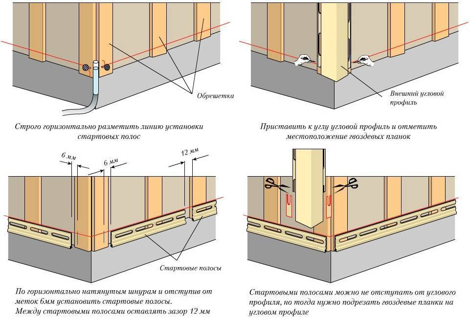 Первой на стенах закрепляется стартовая планка. Для этого вокруг дома на гвоздиках по уровню натягивается веревка на высоте 3-4 см от нижнего края монтируемой обшивки. Стартовые профиля крепятся по периметру здания не встык, а с промежутками в 5–6 мм на случай их температурного расширения.