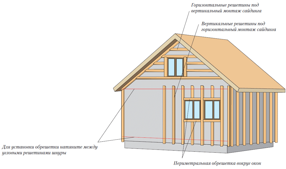 Обрешетка делается вертикальной либо горизонтальной с расстоянием меж реек (профилей) 30–40 см. Эти направляющие необходимо располагать поперек основных виниловых планок. А вот поперечных перекладин между ними не должно быть по определению. Своими руками обшивать дом сайдингом надо так, чтобы под панелями оставалось пространство для естественной циркуляции воздуха.