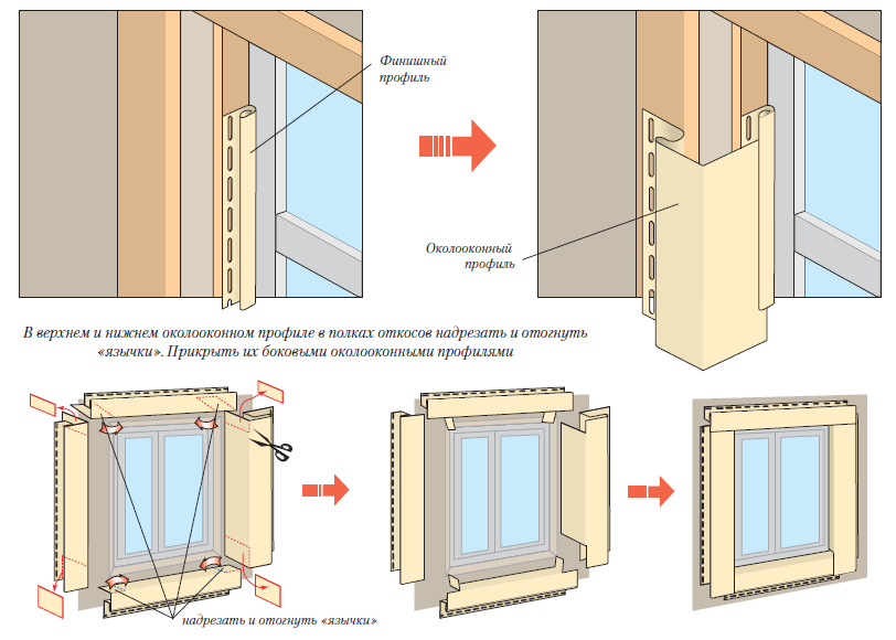Установка начинается с водоотлива. Он является жесткой конструкцией, поэтому крепиться легко. После чего, при помощи саморезов крепят угловые профили. Следующий этап – крепеж стартовой планки на водоотлив вдоль разметки. По периметру окон выполняется крепление оконных планок или J-профилей так, чтобы расположение наружного нижнего края было немного ниже внутреннего.