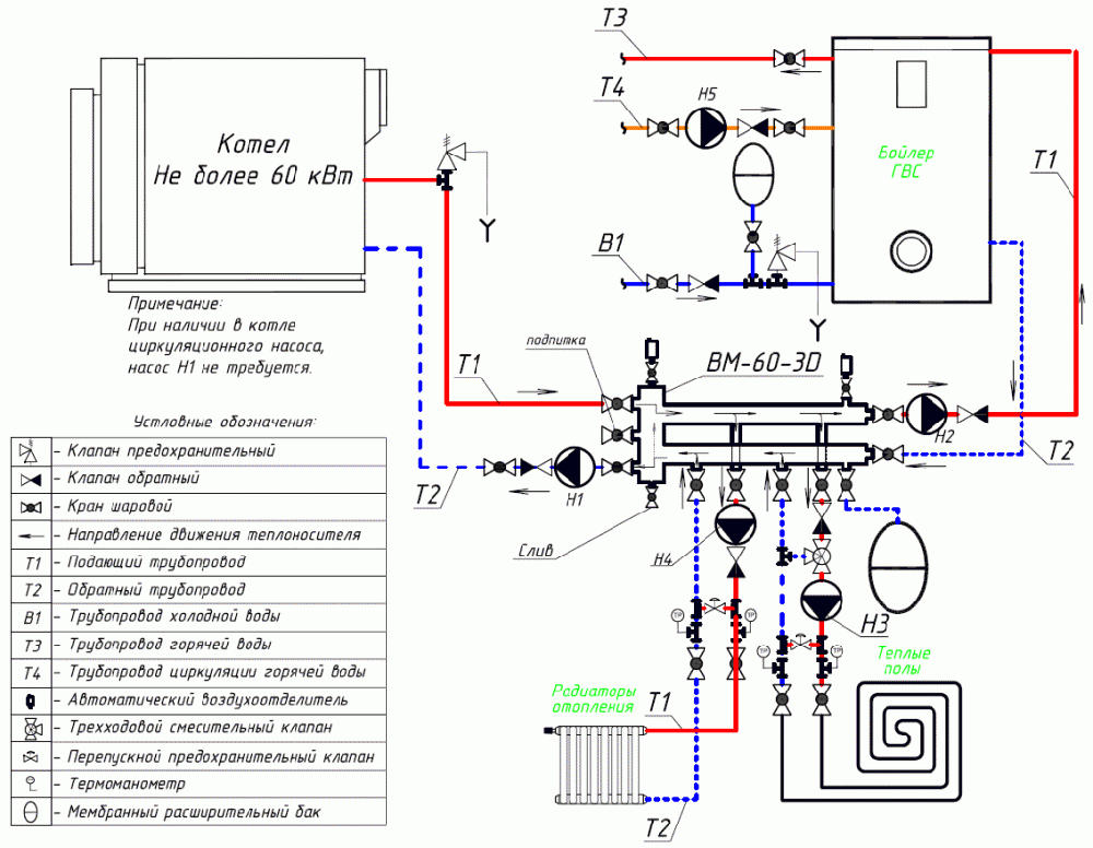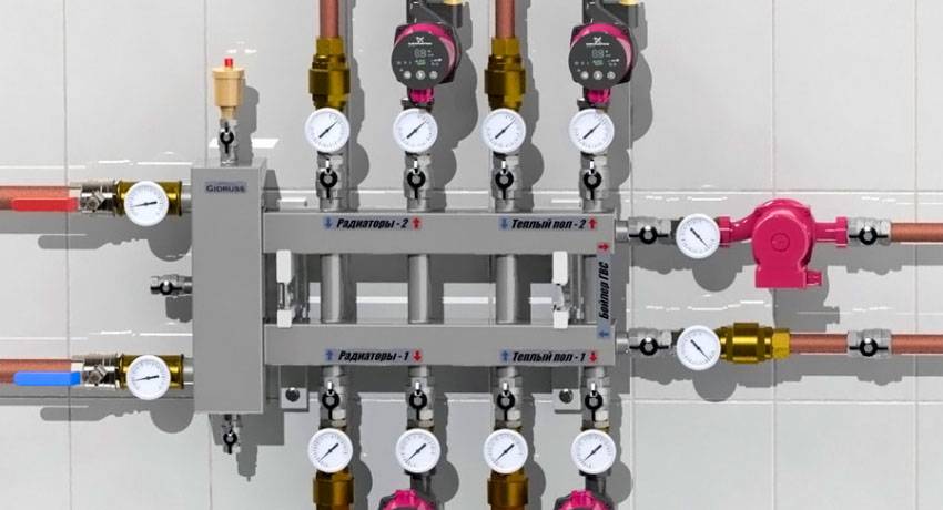 - Первое — она исключает гидродинамическое влияние, при отключении и включении некоторых контуров в системе отопления, на весь гидродинамический баланс. Например, при использовании радиаторного отопления, теплых полов и нагрева бойлера, имеет смысл разделять каждый поток на отдельный контур, для исключения влияния друг на друга.(смотрите)
