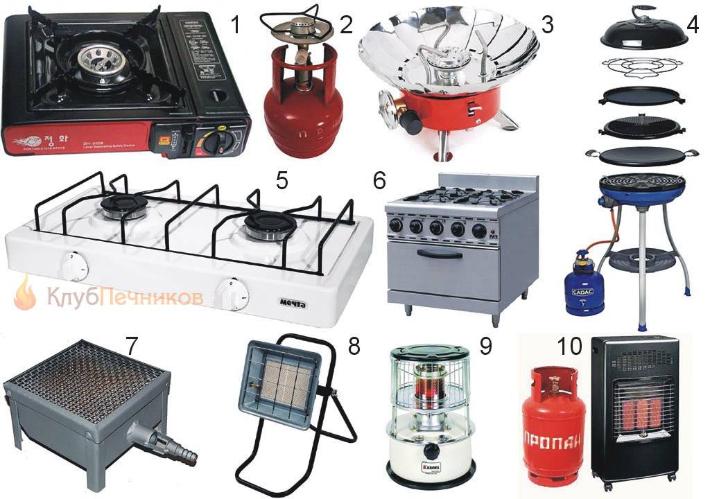 Для готовки на одного человека в местах, совсем удаленных от благ цивилизации, оптимальным выбором будет печка-таганок, пп. 1-3 на рис. Поз. 1 – туристско-охотничий мини, его заправки хватает на один-два дня. Для более длительного использования (скажем, для кочующей пасеки) нужно брать таганок с баллоном увеличенной емкости (п. 2), его хватает на неделю-месяц. В последнее время в продаже появилось нововведение: таганок с отражательной горелкой, поз. 3. Отражатель теплового излучения на варочную посуду позволяет экономить 15-20% газа.