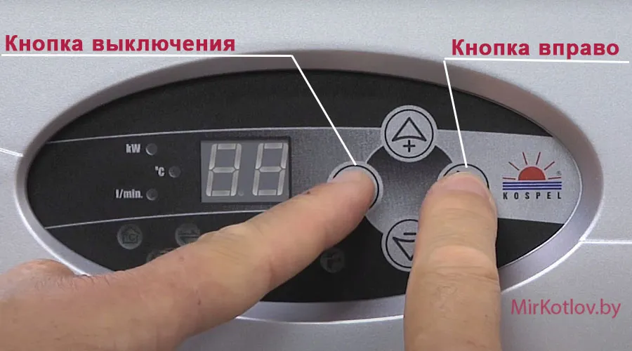 Котел выключился. А далее удерживая стрелку вправо, нажать кнопку включения/выключения.