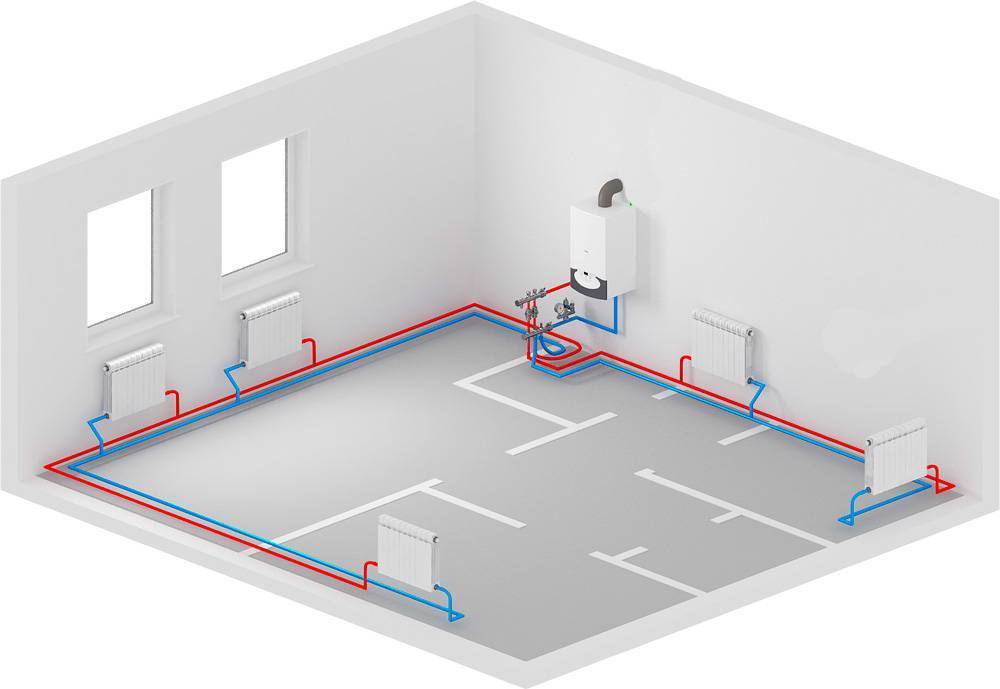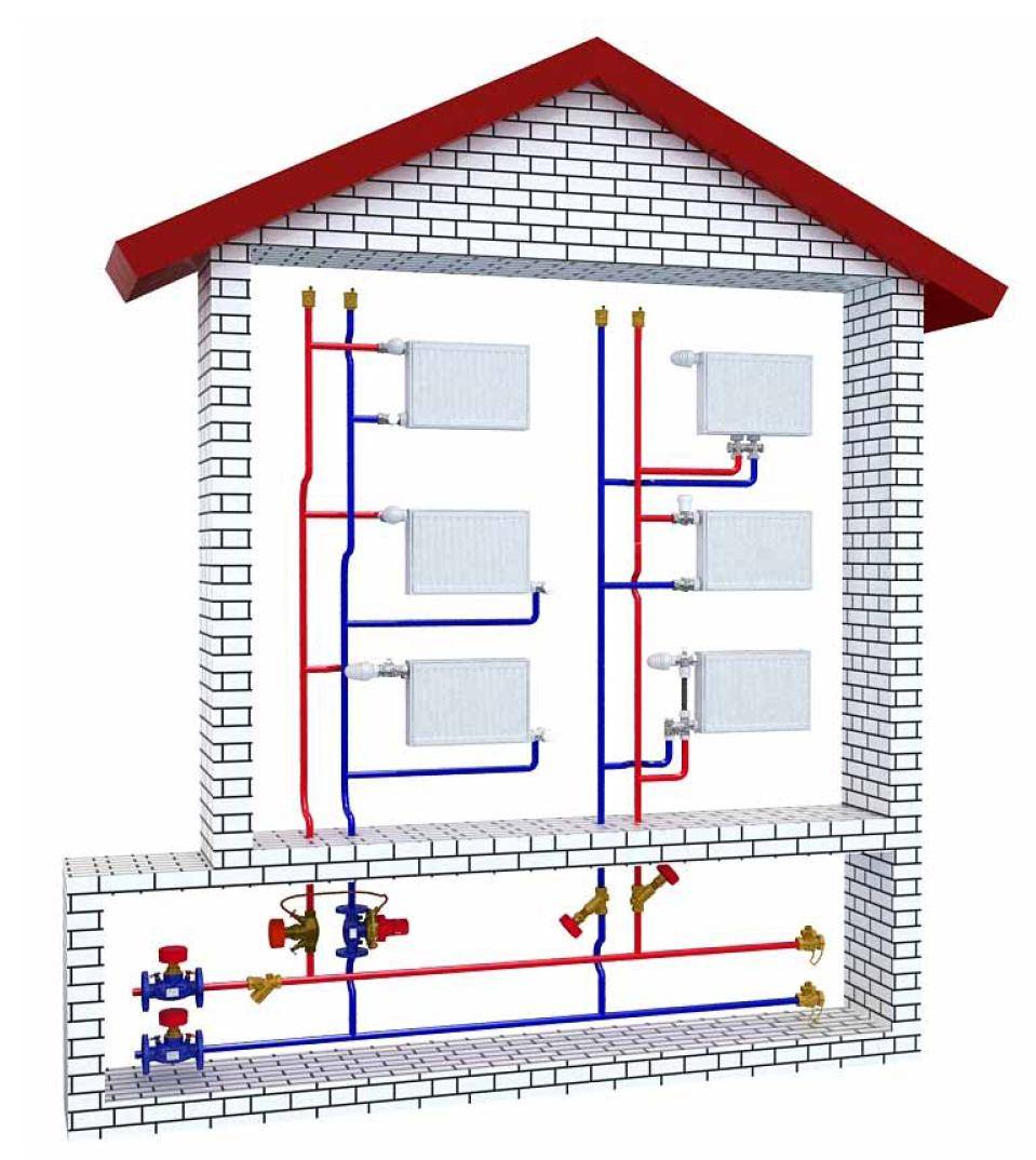 Такие системы могут обладать не меньшей эффективностью, чем однотрубные. Этот способ подходит при обогреве домов с одним и двумя этажами. Его отличие в том, что температуру можно самостоятельно менять в любом помещении.