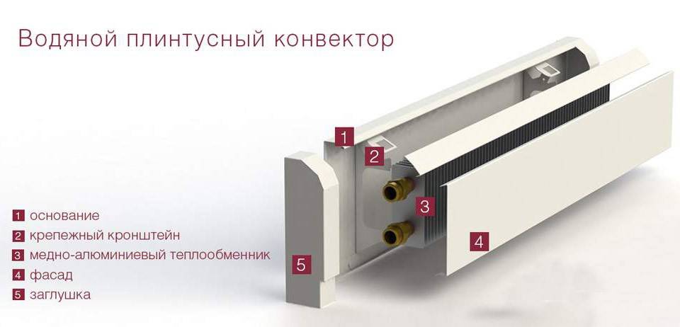 Установка водяного теплого плинтусы своими руками – процесс сложный. Система должна получиться не только эффективной, но и герметичной, чтобы не залить полы и соседей (если они есть). Водяные плинтусные обогреватели представляют собой малогабаритные конвекторы. Основой для их изготовления служат цветные металлы – медь и алюминий. Проходящие внутри трубы делаются из меди, а радиаторы – из алюминия.