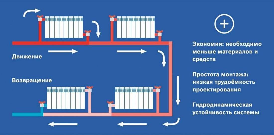 | Проточная | Невысокая цена. Требуется минимум труб и других элементов. | Для ремонта или профилактики нужно отключать всю систему. Большая разница температур между первым и последним отопителем. |