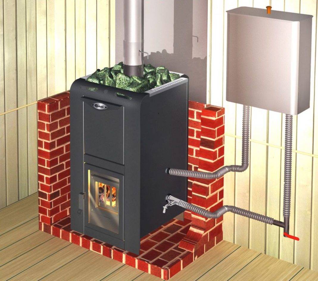- Иногда по желанию потребителя рядом с каменкой навешивается дополнительно бак с водой.