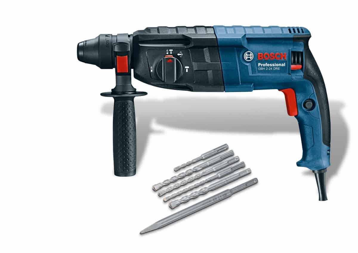 Перфоратор понадобится для работы. Если предполагается установка нагревателя с электрической спиралью, то к точке монтажа выносится розетка питания. Кабель проводится под отделочными материалами (например, кафельной плиткой), допускается крепление проводов в пластиковых коробах, расположенных поверх финишной отделки стен. Для коммутации используется кабель серии ВВГ-Нг, оснащенный жилой заземления. Сечение проводников подбирается по мощности нагревательного прибора.
