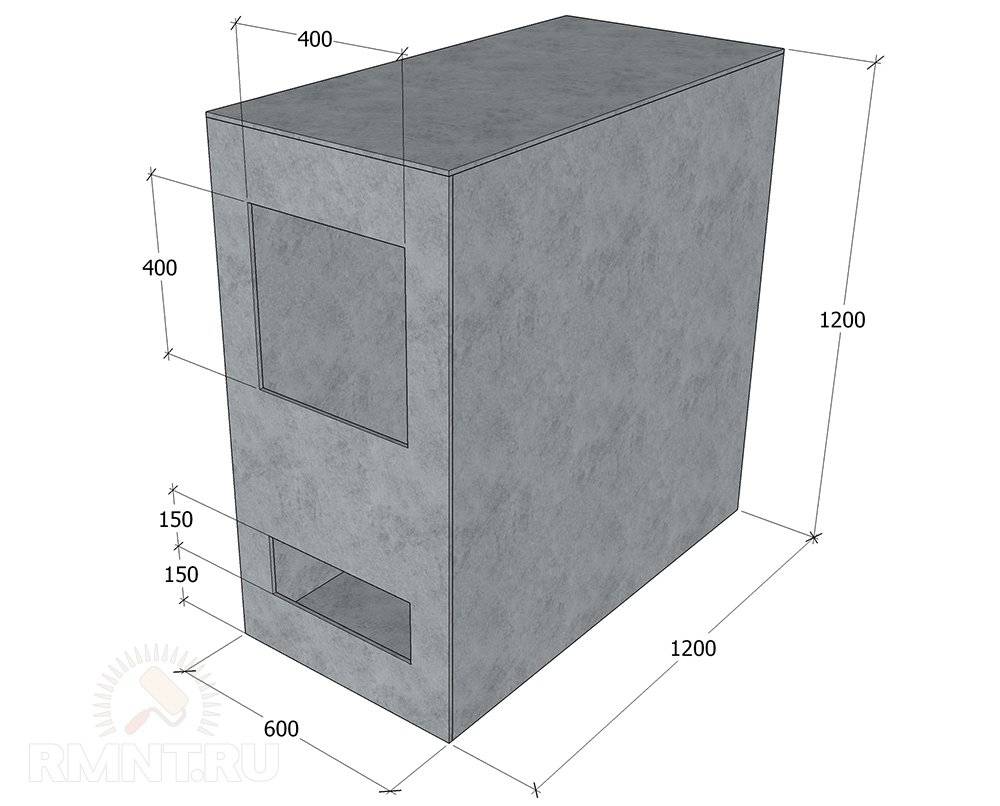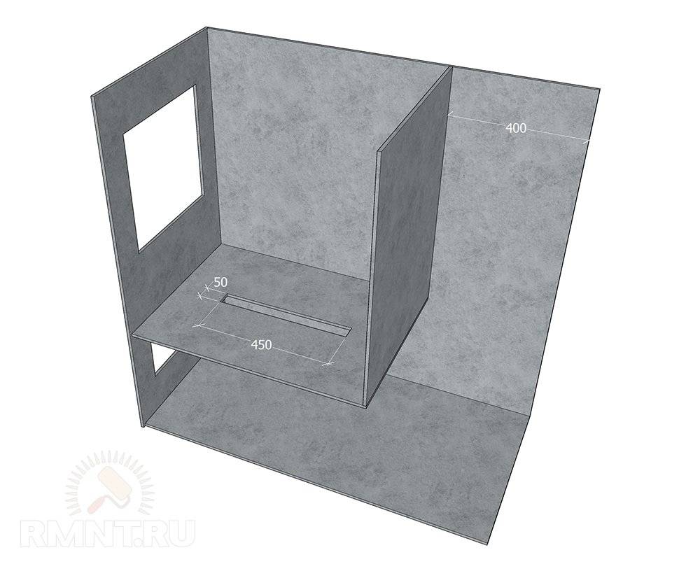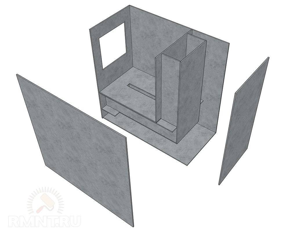 Основа двухкамерной топки — наружные боковые стенки. Они общие для обеих камер, соединяются посредством передней стенки, в которой проделаны два прямоугольных отверстия для дверец. Нижнее отверстие предназначено для обслуживания камеры сгорания, его высота должна быть порядка 120–150 мм, ширина — не менее 300 мм, располагается отверстие с отступом в 150 мм от нижнего края. Верхнее отверстие предназначено для загрузки камеры газификации, чем оно будет больше — тем лучше, располагаться отверстие должно не ближе 100 мм к верху камеры. Снизу и сзади топка замыкается цельными листами, которые вырезают по внешним габаритам топочной камеры, но не приваривают до окончания сборки внутренних деталей. Сверху котёл накрывается листом номинального сечения.