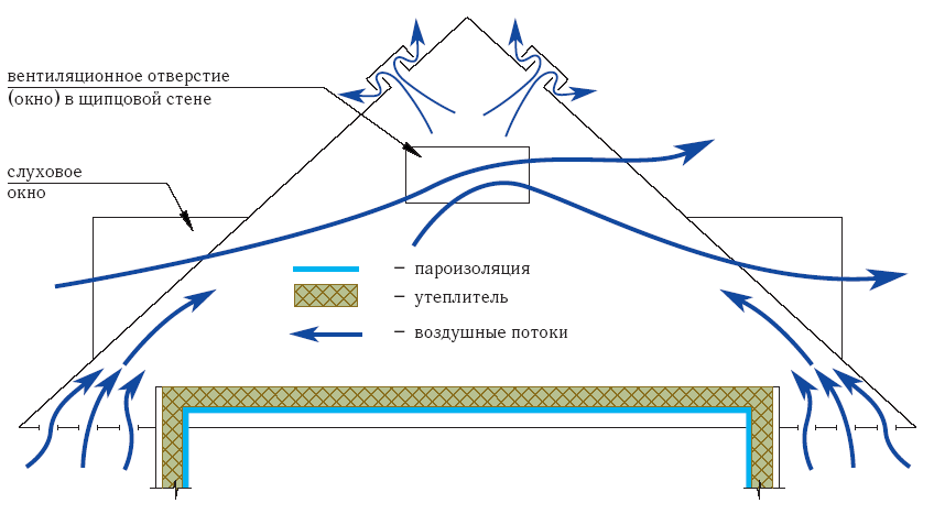 Температура в чердачном помещении не опускается ниже 00 даже в лютые холода. В летнее время для проветривания достаточно открыть настежь окна, обеспечив приток свежего воздуха.