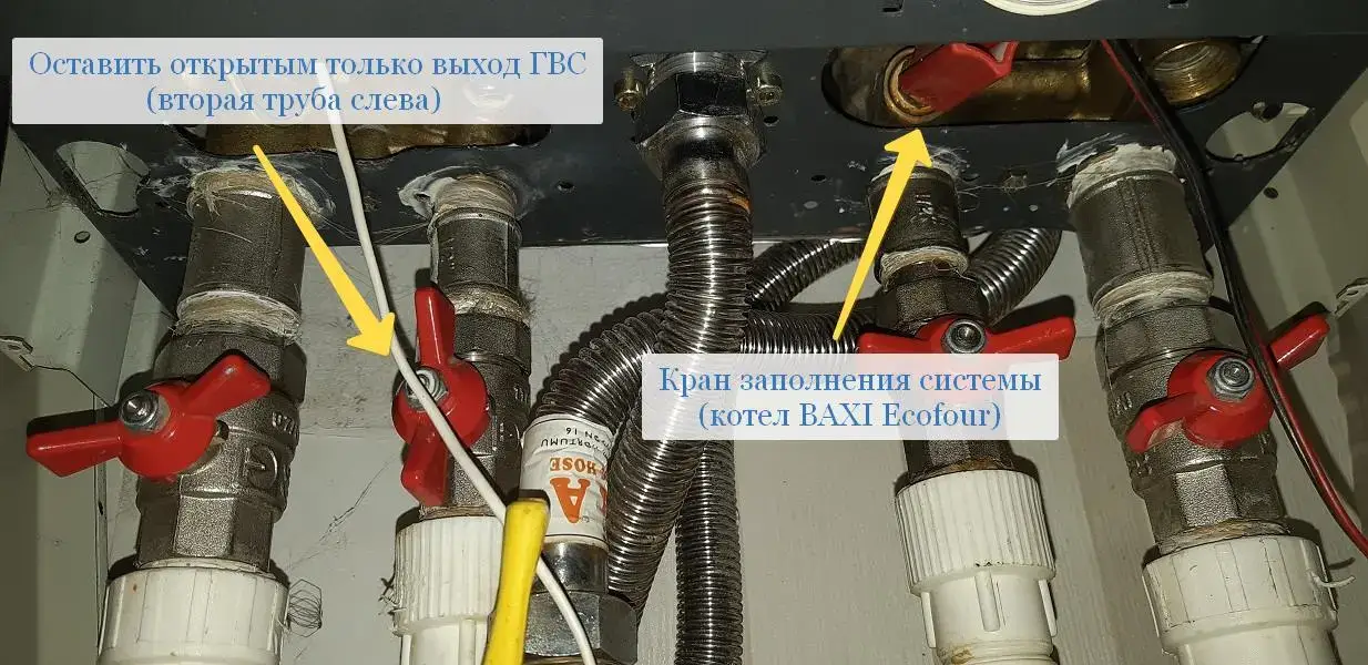 Если всё сделано правильно, вода из системы отопления (которая под давлением) будет свободно выходить через кран разбора бытовой воды.