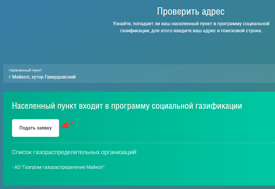 - Перейдите на портал оператора госпрограммы газификации в раздел проверки адреса;