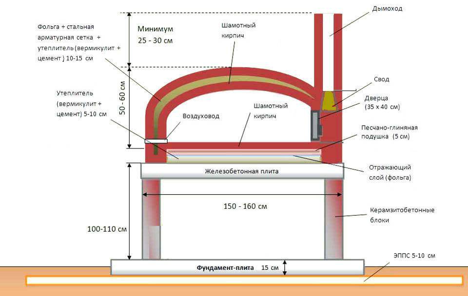 Под (дно) помпейской печи выкладывается из огнеупорного кирпича. Снизу слой кирпича обязательно теплоизолируется.