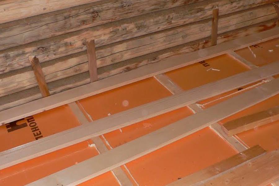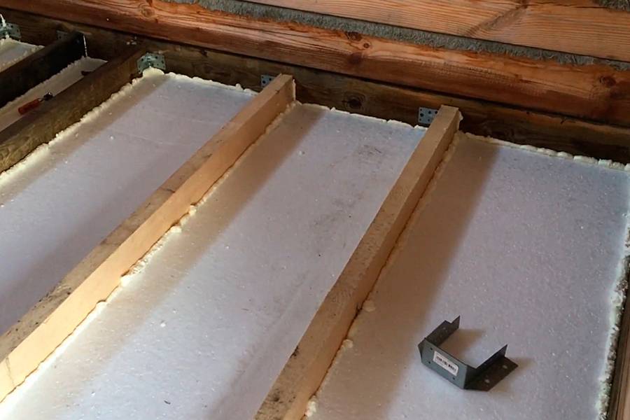 - Снизу балок прикручивают черепные бруски, затем на них настилают черновой пол.