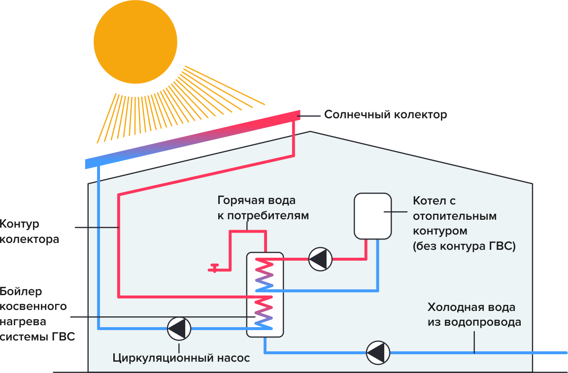 Этот вариант подразумевает использование емкости косвенного нагрева, которая работает на твердом или «голубом» топливе. Поздней весной и летом котел можно отключать, поскольку воду будет нагревать коллектор. А вот зимой эффективность гелиосистем в северо-восточных регионах России не очень велика, так как интенсивность солнечного излучения минимальна. По этой причине коллектор используют в качестве источника дополнительного подогрева к отопительным системам.