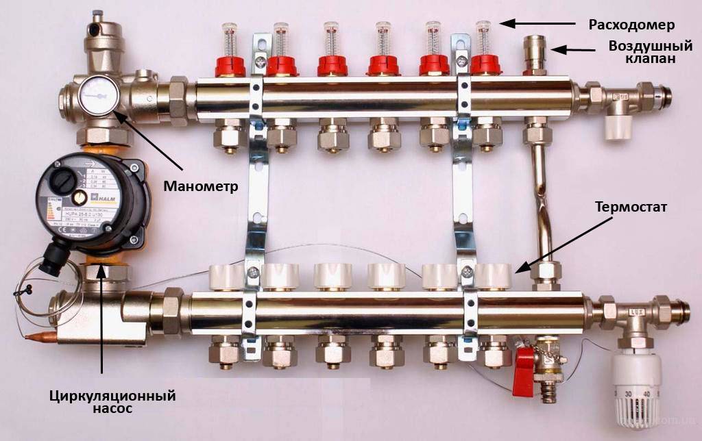 Самые дорогостоящие элементы в коллекторном распределительном блоке — расходомеры и термоголовки. Чтобы избежать переплаты за лишние элементы, можно купить коллекторный узел, так называемую «гребёнку», и установить необходимые регулирующие приборы своими руками только там, где это необходимо.