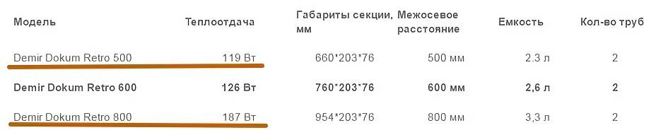 Существуют усредненные значения мощностей, которые можно учитывать при расчете батарей из разных материалов. Так, одна секция батареи с осевым расстоянием 50 см излучает следующее количество тепла: