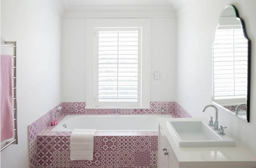 Нежно-розовый тон в модной плитке для ванной комнаты для юных девушек, для других до бордо. Комбинации разных оттенков, эффектные переходы от светлых тонов до темных создаст неповторимый интерьер ванной комнаты.