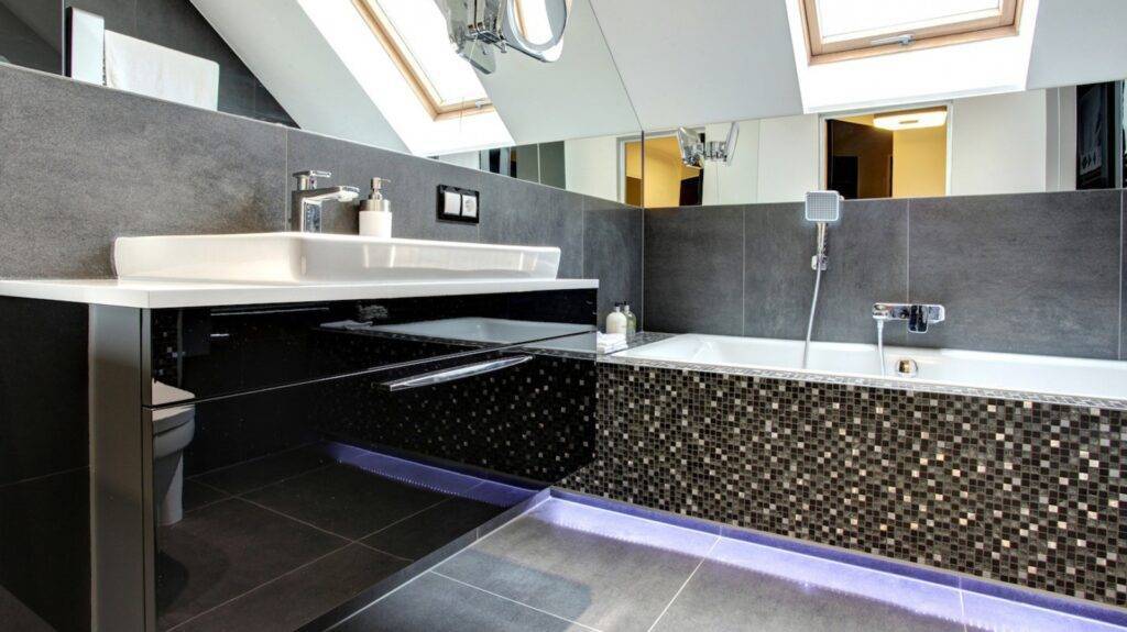 - Зонирование строго с привязкой к функциональным участкам (раковина, душ, ванна).