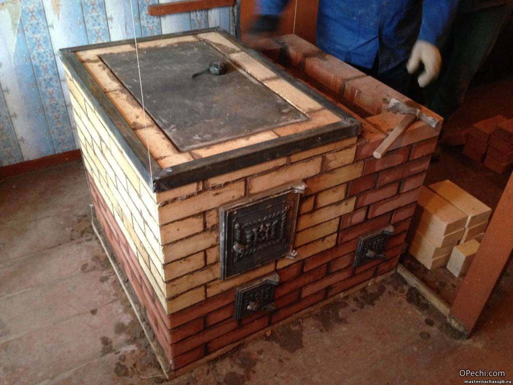Отопительную печь с варочной поверхностью поднимаем на 11 рядов кладки. Верхний «обвязочный» ряд укладываем тычком, чтобы в дальнейшем положить на него варочную панель и декоративную плиту.