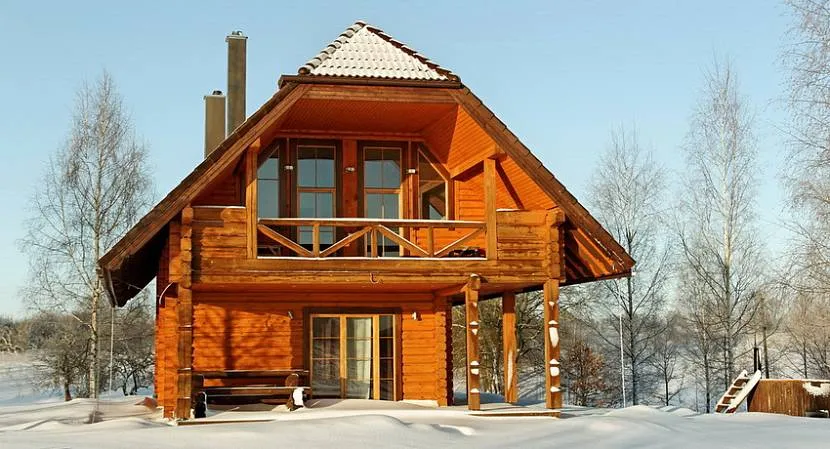 Главный строительный материал – оцилиндрованное бревно, брус. Воздух в таком доме насыщен полезными ароматами древесных смол, микроклимат максимально благоприятен для человека. Дерево хорошо держит тепло, зимой защищает от холода, летом от зноя. Отличительная особенность во внешнем облике – бревенчатые элементы, из которых сложено крыльцо, покатая крыша, вырезаны красивые колонны. Если в других стилях внутренняя отделка комнат обязательна, то здесь она отсутствует; это сохраняет единство оформления снаружи и внутри жилого здания.