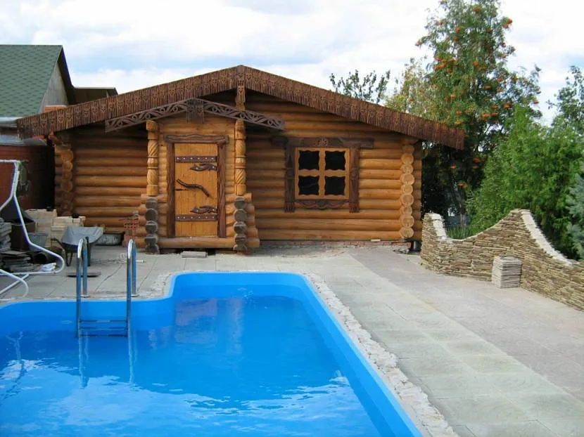 Резная бревенчатая банька, а у входа — бассейн. Жизнь удалась!Источник pinterest.com