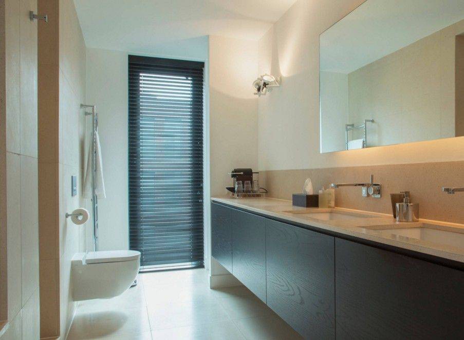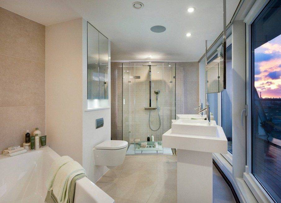 - У длинной стены (не закрытой дверью) монтируют унитаз, а раковину ставят в угол. Между ними должно оставаться пространство не меньше 60 см, поэтому для узкого пространства такой способ не подходит.