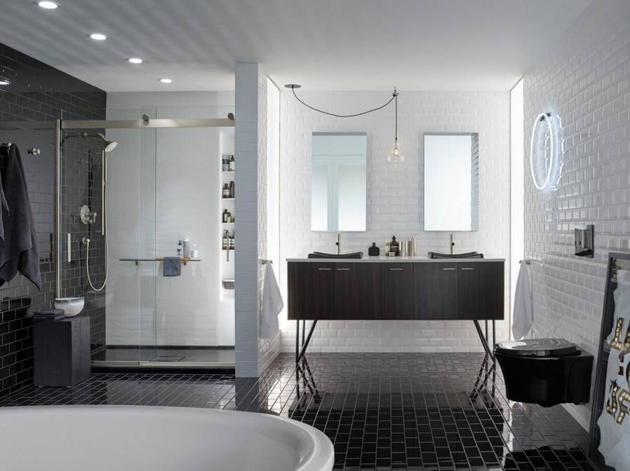 Самым классическим вариантом комбинации красок станет контраст белых поверхностей с черными элементами сантехники. Светлые оттенки прекрасно отражают свет, и тем самым создают баланс для темных.