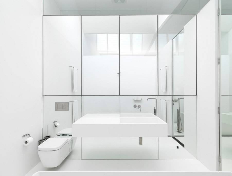 На фото слева стены и потолок окрашены одной краской, что создает эффект продолжения стены. Белое освещение отражается от белой поверхности и добавляет пространства.
