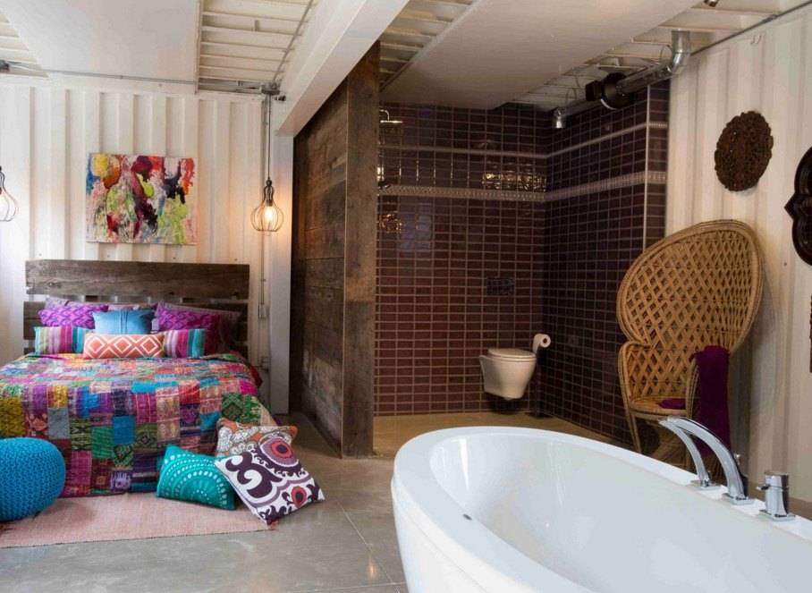 Дом, похожий то ли на корабль, то ли на утюг, то ли на кусочек шоколадно-бисквитного торта, обладает жилой площадью 55 кв. метров, включает в себя просторную гостиную, кухню-столовую, спальню, детскую комнату, кладовую и даже балкон. Огромное окно в торце здания и минимум перегородок обеспечивают ощущение простора.
