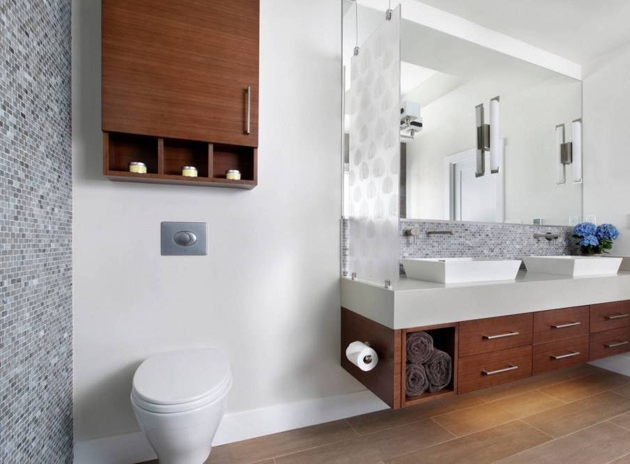 Помимо сантехники лучше отказаться от размещения в компактном туалете стиральной машинки и шкафов. Можно ограничиться настенным шкафчиком или полкой, нишей для хранения бумаги и чистящих средств.