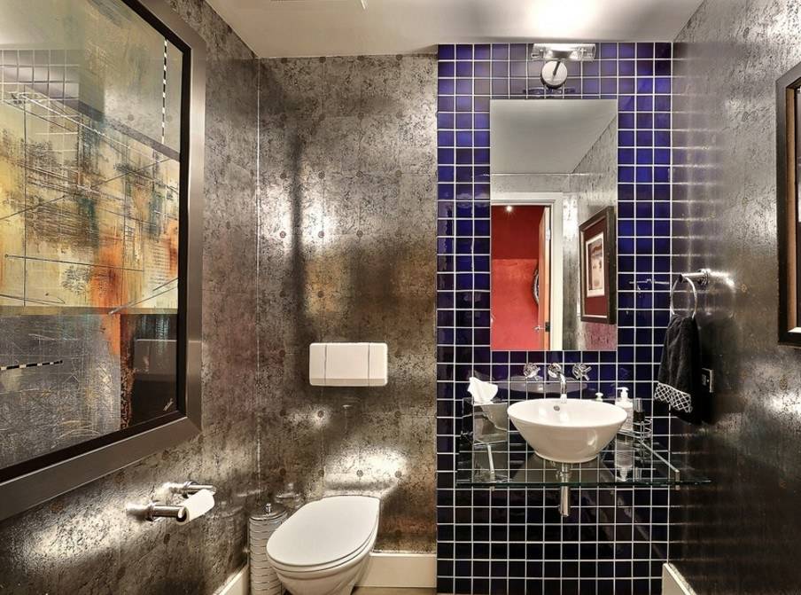 Краска. Почти совсем забытый декор ванных комнат. Довольно удобный вариант. Красивые цвета или их переливы будут радовать глаз много лет и не выцветут. Можно самим придумать интерьер и нарисовать рисунки. Есть минусы — желательно в местах возможного контакта с водой делать вставки из пластики или керамики. Потому что краска (даже влагостойкая) не сможет длительное время сохранять первозданный колорит при длительном контакте с водой (плесень, кальцинированные отложения).