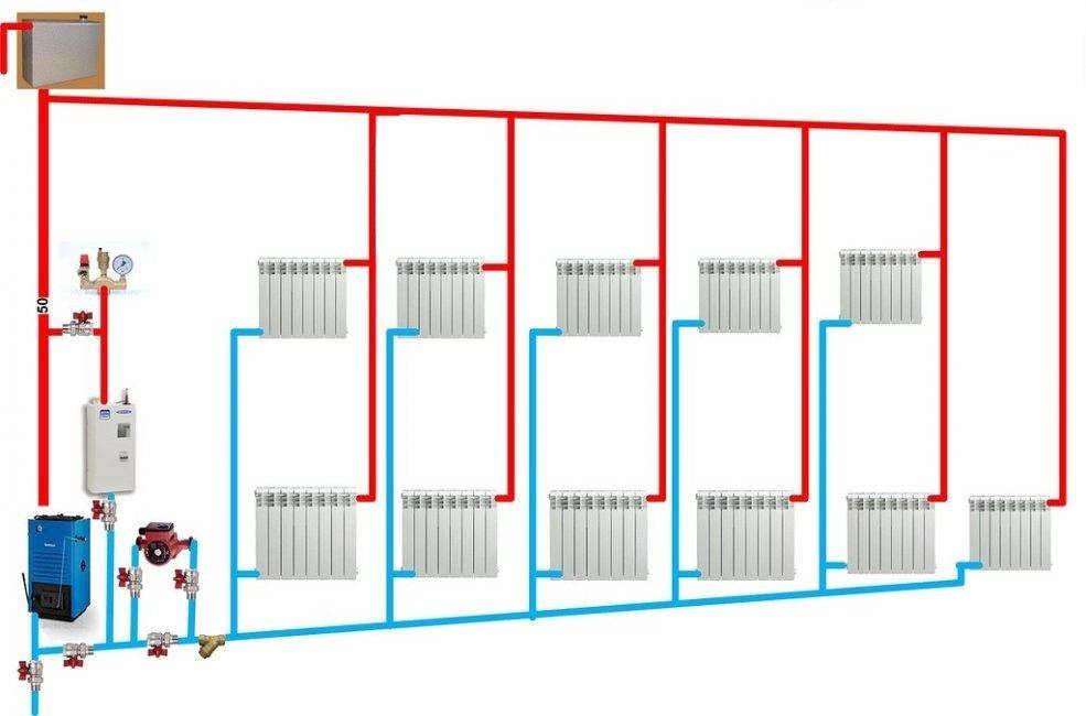 Две основные разновидности двухтрубной системы – тупиковая и попутная – служат базовыми элементами. Общее же устройство всего комплекса отопления имеет следующие конструктивные решения:
