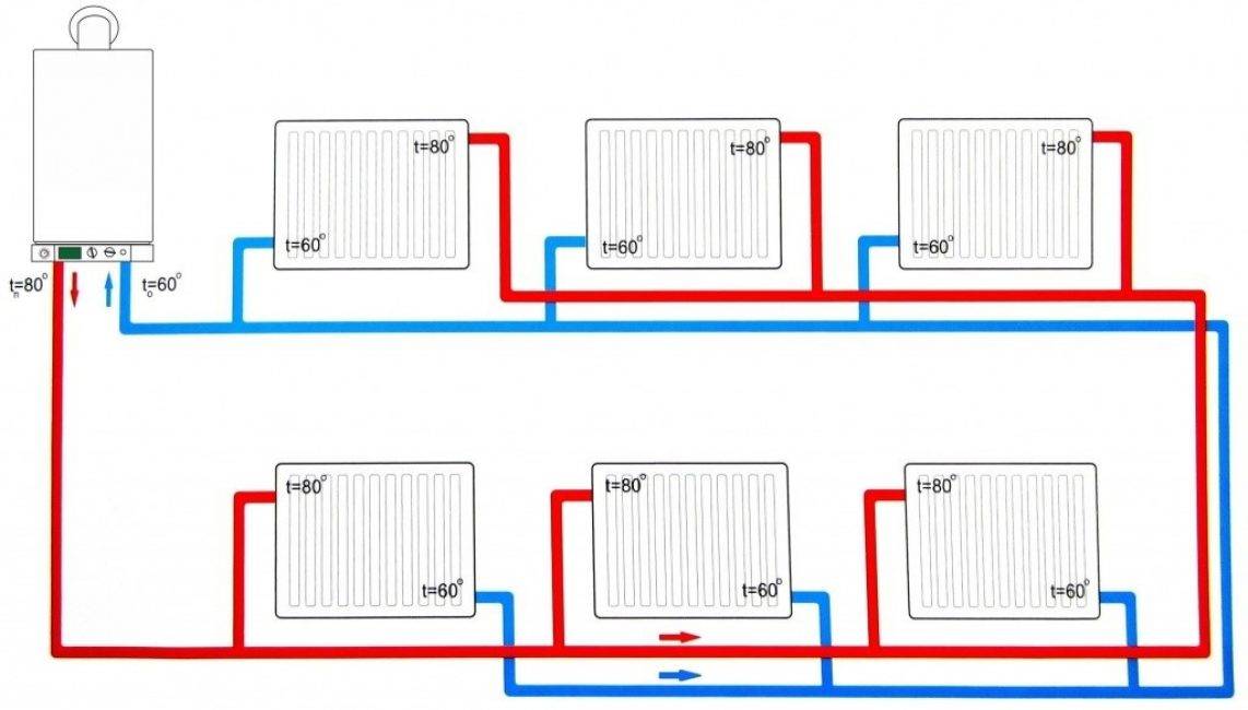 На монтаж линии по схеме Тихельмана требуется больше трубопровода, чем на сборку тупиковой ветви. Применение той или иной схемы обосновывается обычно строительными параметрами отапливаемого здания – размерами и взаимным расположением помещений.